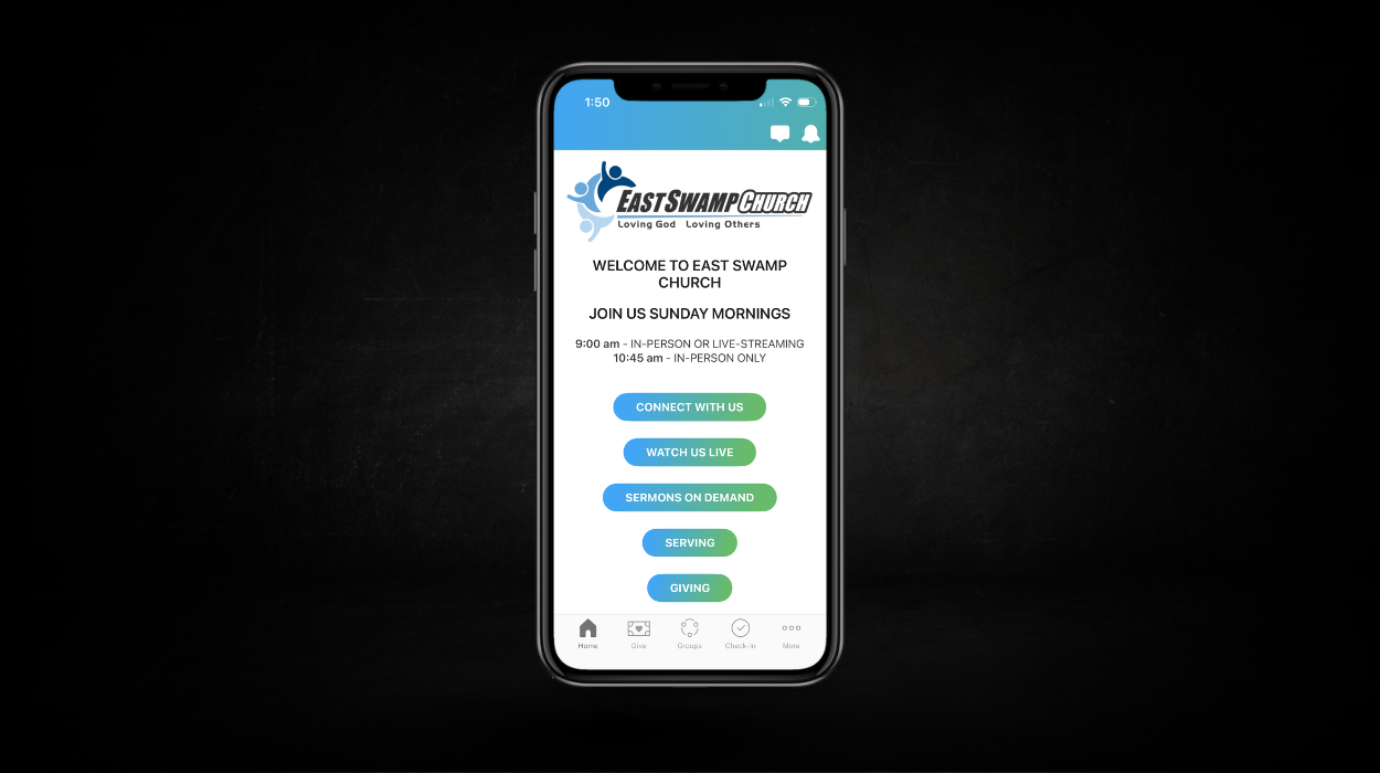 Download our app for an easy way to connect with us, register for events, and find everything you need at your fingertips. After you open the app, search for East Swamp Church, and you're in!